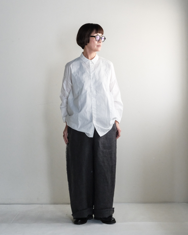 ゆとりのあるリラックスしたシルエットに、繊細な仕上げを重ねることで、全体が上品でやわらかな印象にまとまります。