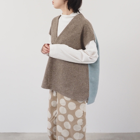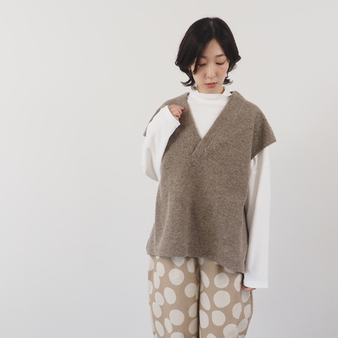 深めのVネックとゆとりのあるアームが、タートルやカットソー、ワンピースにもすっと重なります。いつもの服に重ねるだけで旬の着こなしが完成。