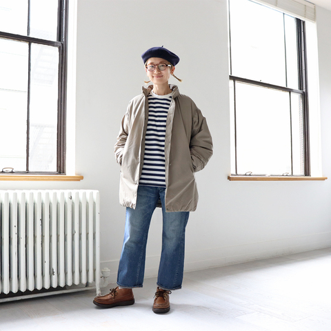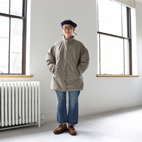 こちらは、落ち着いたトーンが印象的な、軽い着心地のダウンコート。表地にははっ水加工を施した、軽くナチュラルな風合いのリサイクルタスランナイロンを使用。マットな質感の生地に、パッカリングを効かせてスポーティ感を抑え、街着として使いやすいデザインです。中わたは、遠赤外線効果で自然なあたたかさをもたらすクリーンダウン光電子を封入。裏地にGORE-TEXWINDSTOPPER2層構造を使用し、風の侵入を軽減しています。
