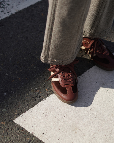 サッカーシューズをルーツに持つ名作「SAMBA OG」のクラシックなフォルムはそのままに、大人の余裕を漂わせるポニーヘア仕様モデル。