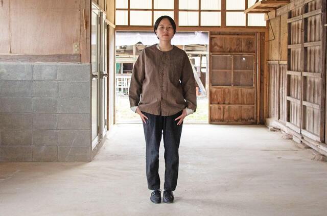 なるべく自然のものを使いたいから、木製のボタンを採用しています。 ボタンも生地と同一色で染め上げています。