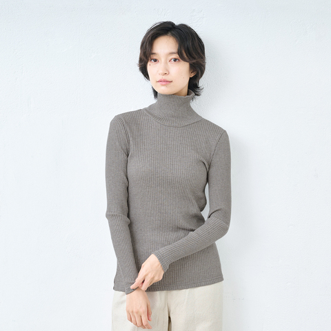 希少なヤク混テレコ素材を使用した、タートルネックのプルオーバー。程よい厚みで透けにくく、秋冬から春先まで快適に着られます。伸縮性があり、肩まわりの動きもスムーズ。ナチュラルな杢調で表情のある生地は、シンプルながらも上品で落ち着いた印象。首元までやさしく包むタートルネックは、カジュアルにもきれいめにも着こなせる、大人のナチュラルコーデに便利な一枚。