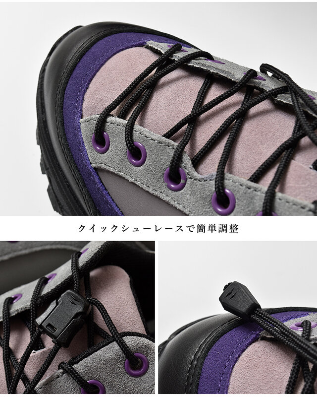 トレッキングベースながらタウンユースのスニーカーとして機能を向上させるため、アウトソールにはVibramのTraction Rag技術(表面積を最大50%増加させ、トラクションを最大25%向上)を駆使したRUSTLEを採用。トレッキング特有の面倒な締め上げはレースをクイックレースにすることで解消しました。街歩きからライトハイク、旅行まで、さまざまなシーンで活躍してくれます。
