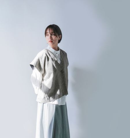 すっきりと開いたVネックラインが、シャープな抜け感を演出。インナーに合わせるトップスの表情を引き立て、レイヤードスタイルを軽やかに仕上げてくれます。程よい深さで、上品な雰囲気に仕上げました。