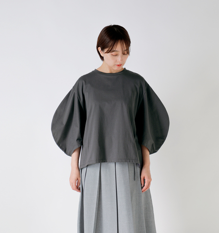 肩から袖にかけて自然な丸みを生み出すシグネチャーの“ラウンドスリーブ”が、カジュアルなTシャツに立体感と清潔感をプラス。腕まわりをすっきり見せながら、リラクシーなムードを演出します。身頃は適度にゆとりを持たせ、身体のラインを拾いすぎない安心のシルエット。着丈もバランスよく整えられており、パンツ・スカートどちらとも相性のいい万能な一枚です。ベーシックながらも“ちょっと違う”存在感で、日常のコーディネートを格上げしてくれます。