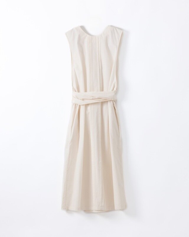 日本の割烹着のエッセンスも加え後ろから手を通して着る形に。普段着の上からさっと着て仕事に入る、サッシュベルトを締めると気持ちも引き締まります。