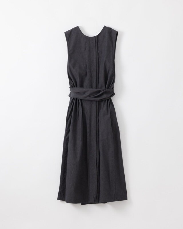 日本の割烹着のエッセンスも加え後ろから手を通して着る形に。普段着の上からさっと着て仕事に入る、サッシュベルトを締めると気持ちも引き締まります。