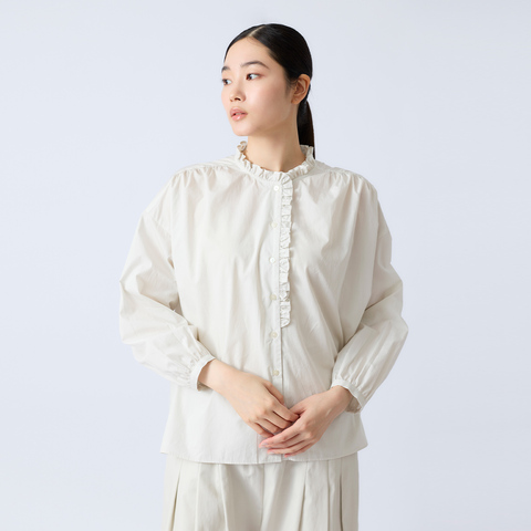 襟元と前立てにフリルをあしらい、さりげなく華やかさを添えたデザイン。