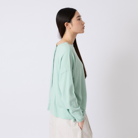カーディガンとして羽織るのはもちろん、ボタンをすべて留めて後ろに回せば、ワイドシルエットのプルオーバーとしても着られる便利なデザインです。