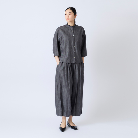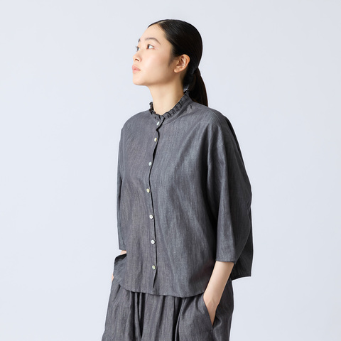 スタンドカラーにあしらったフリルが、やわらかな印象を添えています。