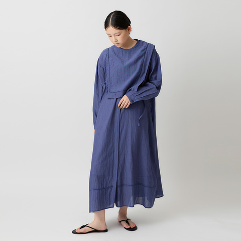 ベストタイプのトップスには梯子レースを施し、シンプルなワンピースに奥行きとさりげない華やかさをプラス。裾にも同じ梯子レースをあしらうことで、軽やかな抜け感を演出します。