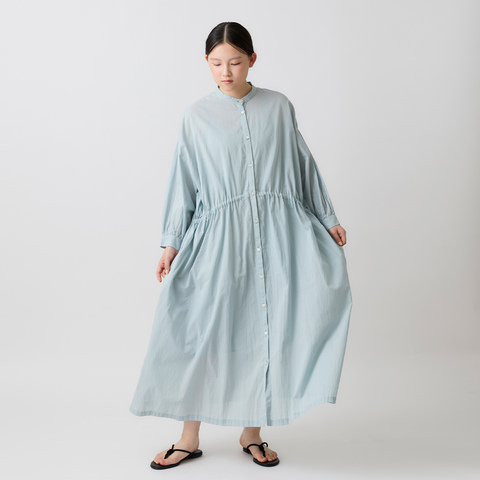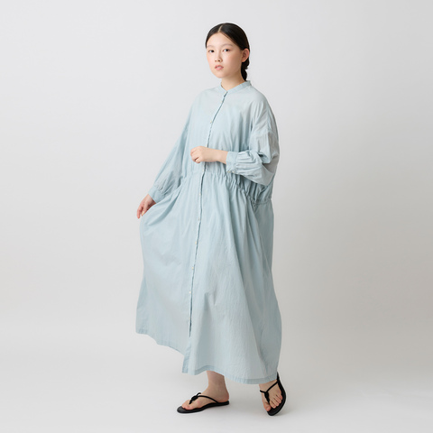 すっきりとしたバンドカラーと前開きデザインで、甘さを抑えたバランスに。