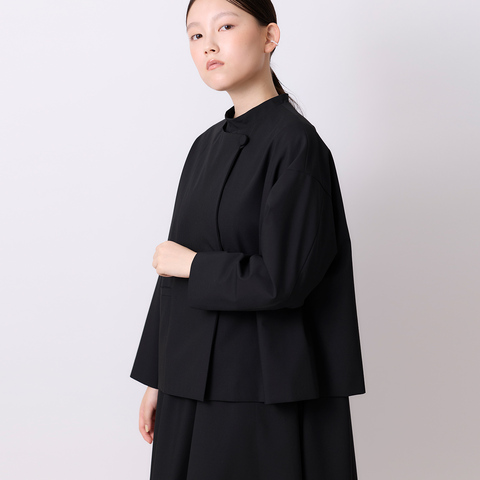 ボタンを留めて着用すると、ブラウスの襟と袖のディテールがさりげなく映えます。