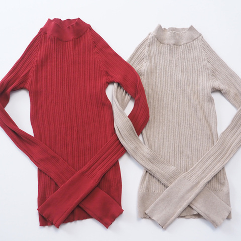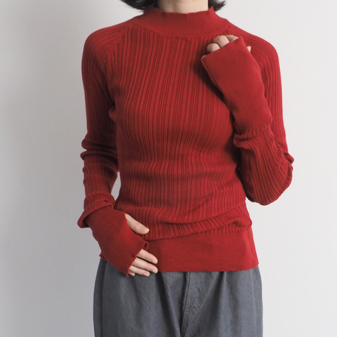ランダムリブの凹凸がやさしく体に沿い、サムホール付きの長め袖が手元まで包み込んで、着るたびにほっとするディテールです。