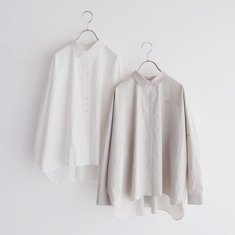 ゆったりワイドな身幅と深く落としたドロップショルダーが特徴的。襟はきちんと感を演出するレギュラーカラーにすることで全体のバランスを整えています。前後差のある着丈は前はすっきり、後ろはタックを入れてふんわりと広がるシルエットに。一枚で着ても、羽織りとしてもサマになる絶妙なサイジングが洗練された印象を与えます。