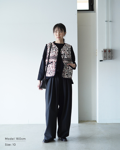 オールブラックにキルトのジレを。ヴィンテージライクな柄が、ミニマルな黒を一気にモードへシフト。
