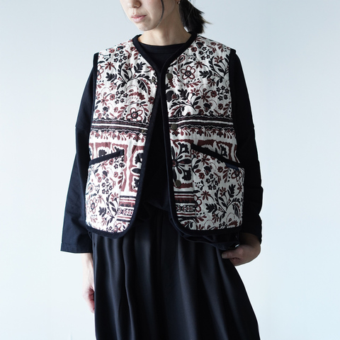 ヴィンテージライクな柄が目を引く、クロップド丈のジレです。レトロなタイル柄を思わせるジャガード生地にリーフキルトを施し、シンプルな着こなしにも上品なアクセントを添えてくれます。