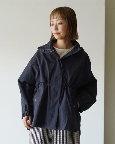 フードは取り外し可能で、ギャザーを寄せればアクセントに。ウエストのドロストでシルエット調整もでき、実用性とデザイン性を両立。