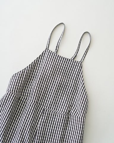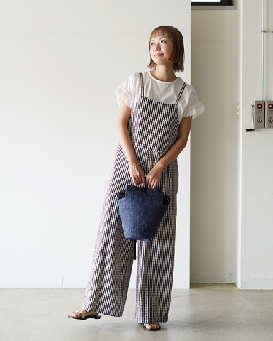 ギンガムチェックのサロペットが主役。程よくワイドなシルエットで、力の抜けた大人カジュアルに。