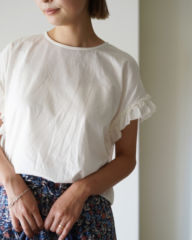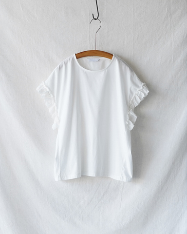 やや長めの袖と3枚接ぎの立体的なフリルで、腕まわりや脇を自然にカバーします。身頃は伸びのよいコットン素材を使用したクルーネックのカットソー仕様で、肌当たりのよい着心地に仕上げました。