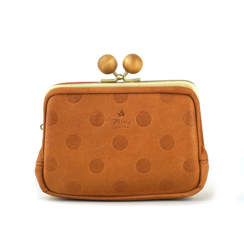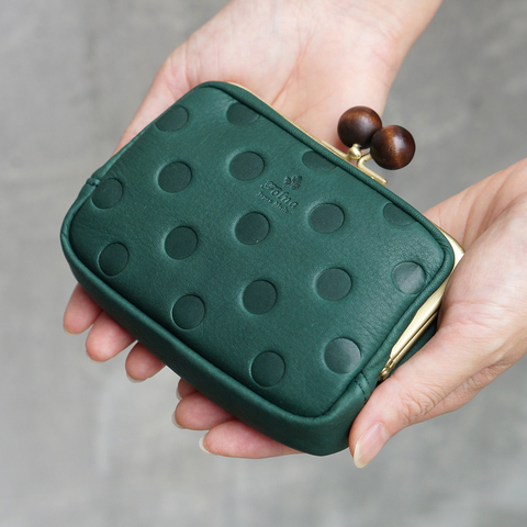 本体はドットの型押しを施した上質な牛革を使用、ふんわりとしたタッチ感の牛革と木玉のがま口とのコンビネーションで、柔らかな印象に仕上がりました。
