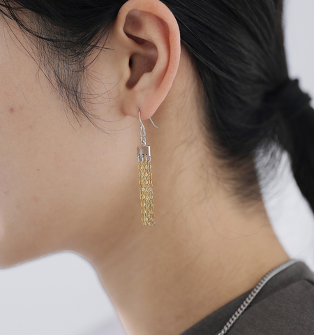 細やかなチェーンを贅沢に重ねたフリンジデザインが、動くたびに繊細なきらめきを放つ一品。まるでベルトのように連なるパーツが軽やかに揺れ、シンプルな装いにも上品なアクセントを添えてくれます。