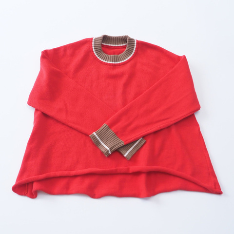 ぱっと目を惹くカラーの中で、全体をやさしくまとめてくれるのが、首元と袖口のバイカラーリブ。シンプルなニットだからこそ、配色・幅・フィット感のバランスを大切に。派手すぎず、地味すぎない。毎日のコーディネートにすっとなじむ、NARUらしい「ちょうどいいアクセント」です。