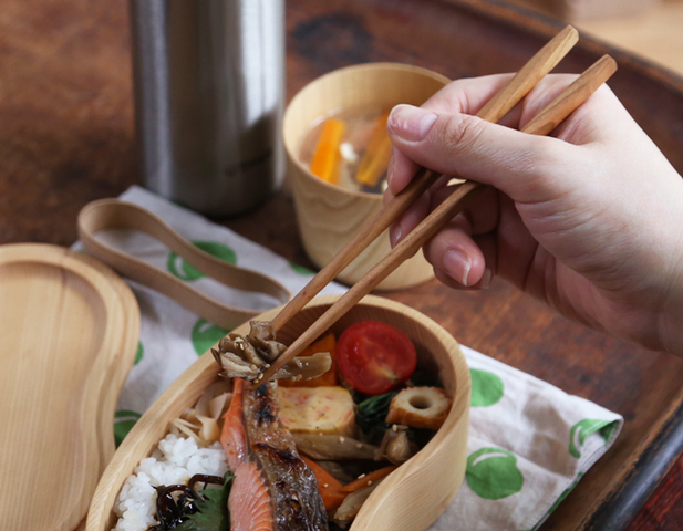 フタは、開け閉め・出し入れがしやすいかぶせ蓋で、同サイズのめいぼく箸がぴったりと収まります。曲げわっぱや木製のお弁当箱に良く似合います。