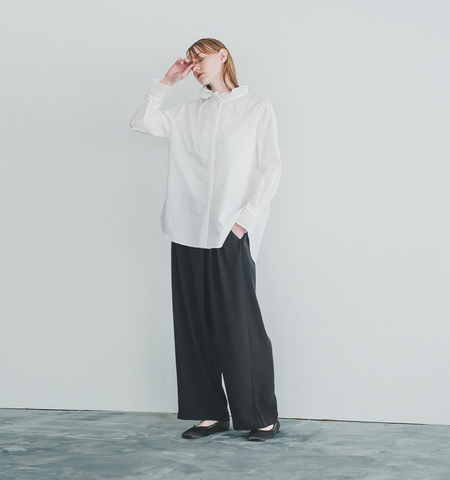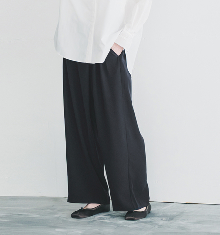 しっかりとウエストで分量を入れて、ゆったりと体のラインを拾わないシルエットを実現。ゆったりとした着用感ながらも、落ち感のあるシルエットで楽に穿いていただけます。