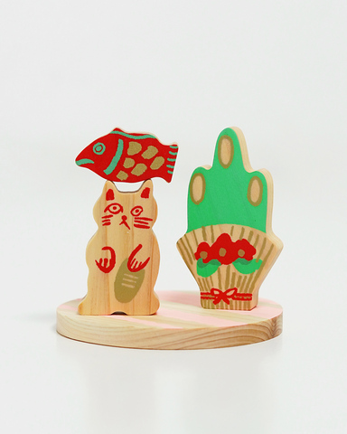 円形の台座と「1月の遊び飾り。」の中から、招き猫、門松、めで鯛を小箱に詰めてお届けします。