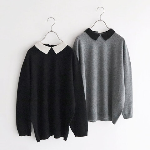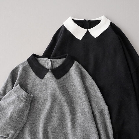 配色になった襟とのコントラストがアクセントになり、シンプルながらも印象的なデザインに。ほどよくゆとりを持たせたシルエットで一枚ではもちろんのこと、ジャケットやジャンパースカートなどのインナーとしても重宝します。後ろ襟にあしらわれたボタンがバックスタイルにさりげないアクセントをプラス。袖口と裾はリブ仕様になっています。