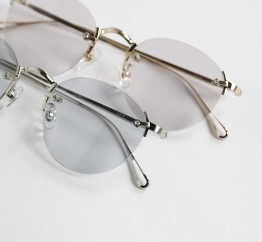 クラックの発生を少なくしたポリアミド樹脂のレンズを採用し、クラシックなレンズシェイプのリムレスフレームにオリジナルライトカラーレンズを合わせてモードな印象にもなるスタイルに仕上げた。