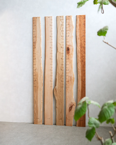 特に「森の身長計」の耳付きタイプは、木の外皮に近い自然な形や表情をそのまま残しています。一本一本異なる木の表情が、家族の成長を見守る“身長計”として、長く寄り添ってくれる存在になります。木の個性を尊重することで、自然とのつながりを感じる暮らしを育みます。