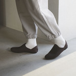 裾ゴムのパンツに目が留まり ついついオーダーしてしまうのですが このパンツもそのうちのひとつ テーパードしたシルエットや ウエストから入れたタックもアクセントになっています