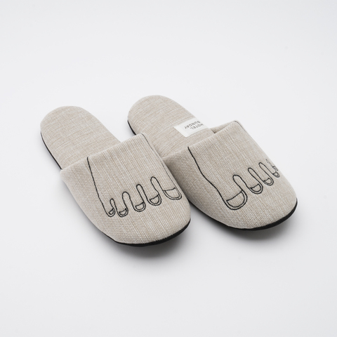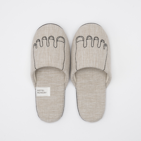 HOTEL SUNDAYの定番アイコン、足の刺繍入りルームシューズ。