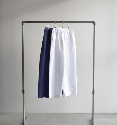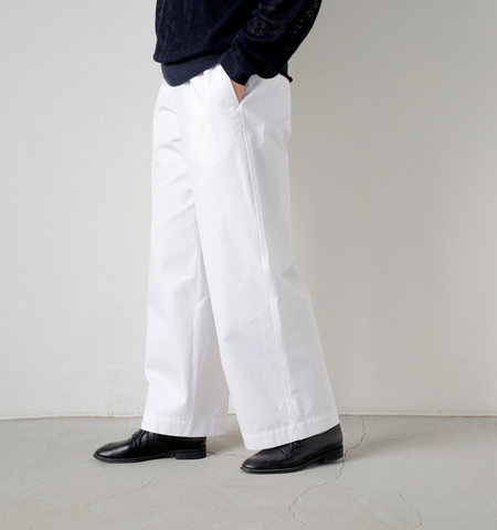 ワイドテーパードシルエットが生み出す、程よいリラックス感と洗練された印象が魅力の一本。ウエストは細めのゴムギャザー仕様に加え、ドローコードを配することで、見た目はすっきりとしながらも快適なフィット感を実現しています。締め付け感が少なく、長時間の着用でもストレスフリー。通気性の良いコットン素材と相まって、暑い季節にも心地よく穿けるユーティリティウェアとして活躍します。