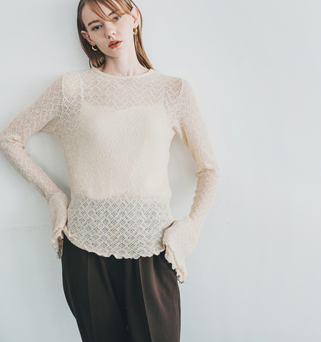 凹凸感のあるレースカットソー生地を使用し、表情豊かな仕上がりに。程よい透け感と伸縮性を兼ね備え、見た目の繊細さとは裏腹に、快適な着心地を叶えます。