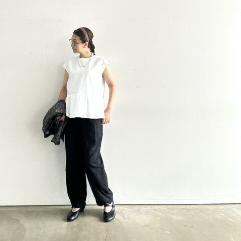 コットンのようなナチュラルな表情のポリエステル素材。(最初サトウはコットンだと思い込んでいたぐらいコットン風)ややハリ感がありさらっとした肌触りです。裾に施されたタックデザインとバックパールボタンがアクセントのシンプルなブラウス。
