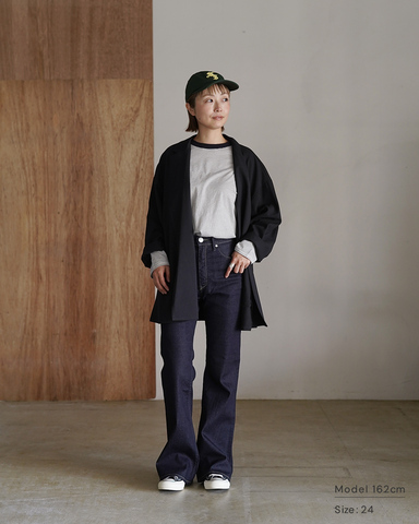 膝位置をやや高めに設定し、そこから緩やかに広がるフレアラインが自然な脚長バランスを演出。腰まわりはすっきりとした設計で、後ろ姿まで美しく見えるヨークとポケット配置もポイントです。
