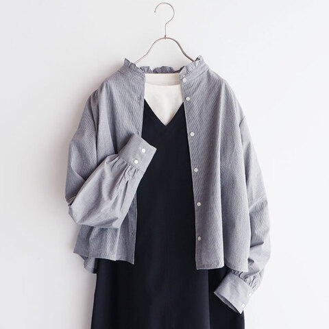 身幅にほどよくゆとりを持たせたシルエット。着丈を少しコンパクトにすることで、ワイドパンツやフレアスカートなどボリュームのあるボトムスを合わせてもバランスよく仕上がります。襟元だけにあしらったフリルも別注のこだわりポイント。華やかさをプラスしつつ、クラシカルで落ち着いた印象を与えます。