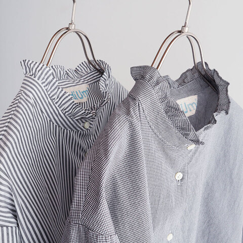 「Midiumi (ミディウミ)」より、襟元のフリルがアクセントになったAIDA general store別注のショートシャツのご紹介です。