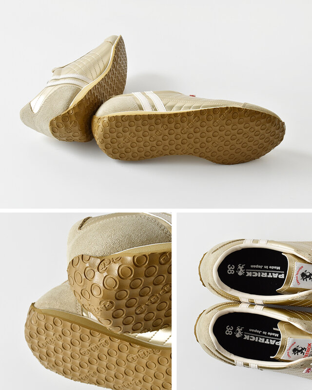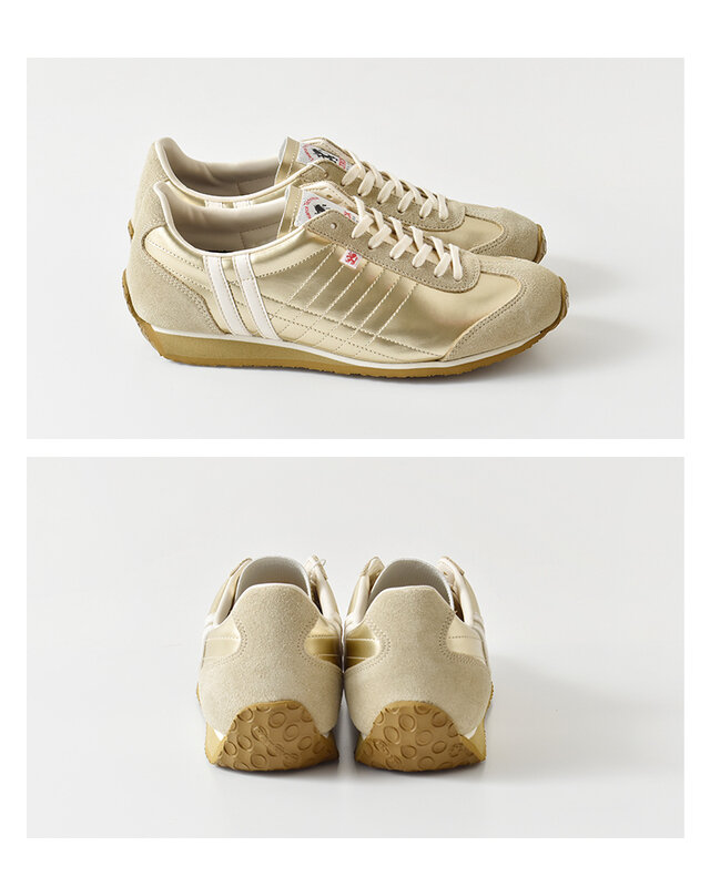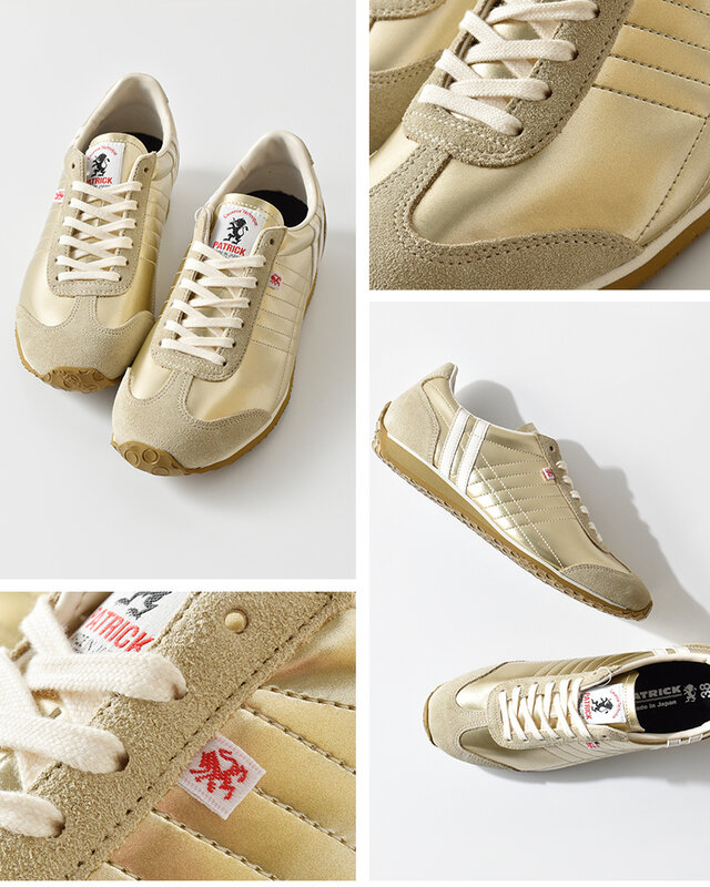 上品な艶感のエナメル調人工皮革を使用した、ゴールドカラーが印象的な一足。アイレットにはベロア素材を採用し、光沢と温もりのコントラストが足元に洗練を添えます。