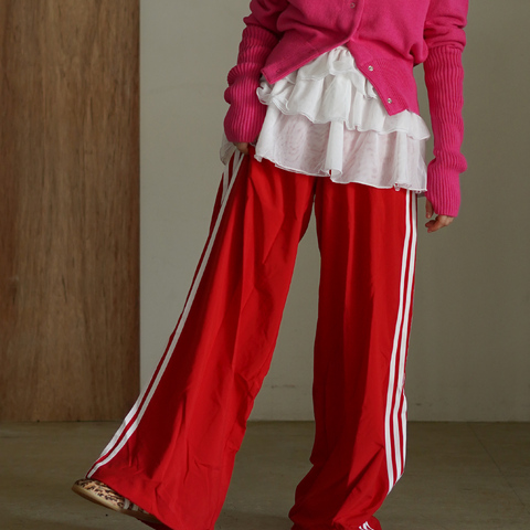 ビビッドなピンクとレッドの配色で、Y2Kムードを感じる旬バランス。甘さのあるフリルレイヤードが、スポーティなパンツを女性らしく中和。