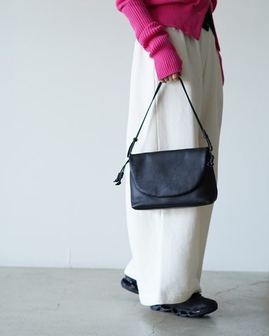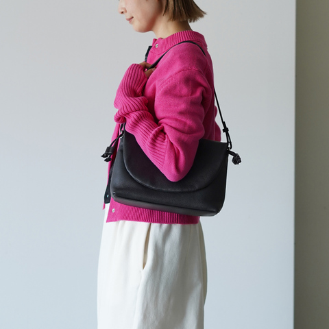 やわらかなレザーの表情が引き立つ、フラップデザインのショルダーバッグ。ふわりとたゆむ立体的なフォルムが、コーディネートに自然な奥行きをプラス。