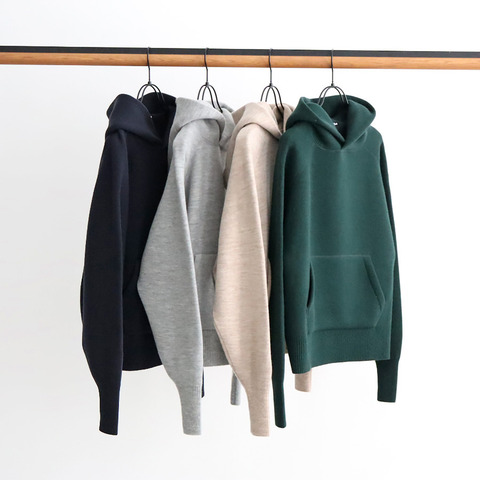 良質なウールを二重織に編み立てた肉厚でソフトなカットソー調のニットプルパーカー。