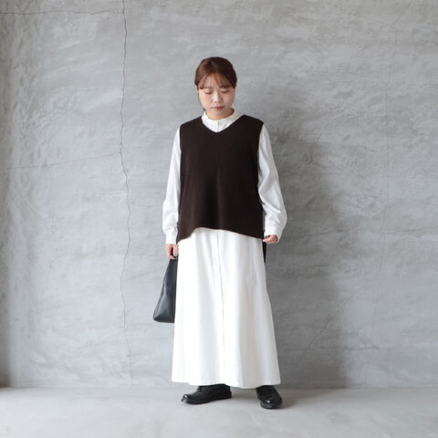 Vネックデザインが首元をスッキリと見せ、シャツやカットソー薄手のタートルネックなどレイヤードもバランスよく決まります。