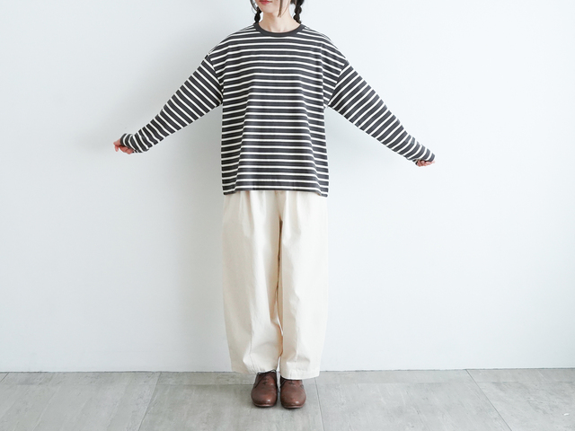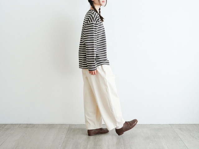 落ち着いたカラーのボーダーは、カジュアルになりすぎず、コーディネートに程よいアクセントを添えてくれます。