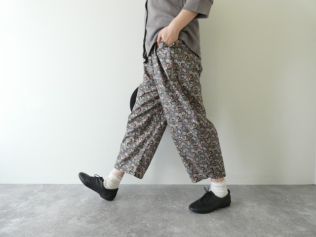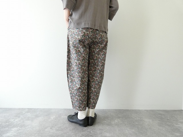 細かな小花が全面にプリントされたエッグパンツ。縫製後、製品洗いをしているため、多少のゆがみ、シワ、生地のアタリがみられますが、製品の特長の1つです。また製品ごとに1点1点表情が異なりますが、どうぞそれぞれの風合いをお楽しみいただければと思います。