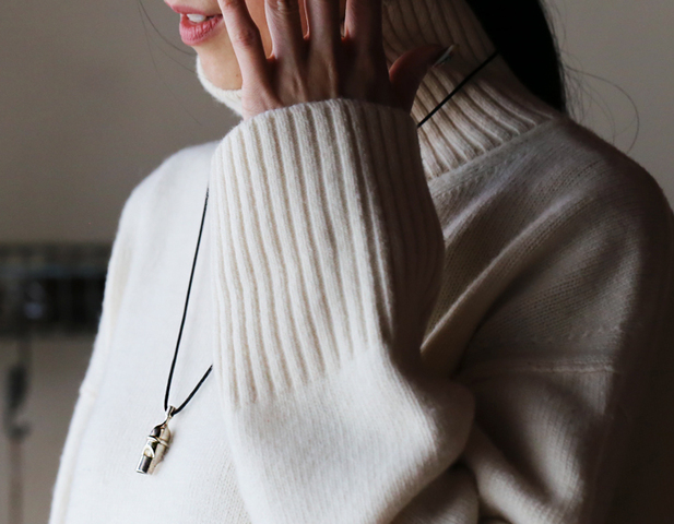 柔らかくて、あたたかい白ニットにちいさな笛がひとつ。誤魔化しがきかない白に、銀925の澄んだ光がスッと乗っかって、余計なことを一切してない潔さ良さ。派手さはないけれども、それだけで、清潔感も、落ち着きも、ちゃんと伝わってきます。