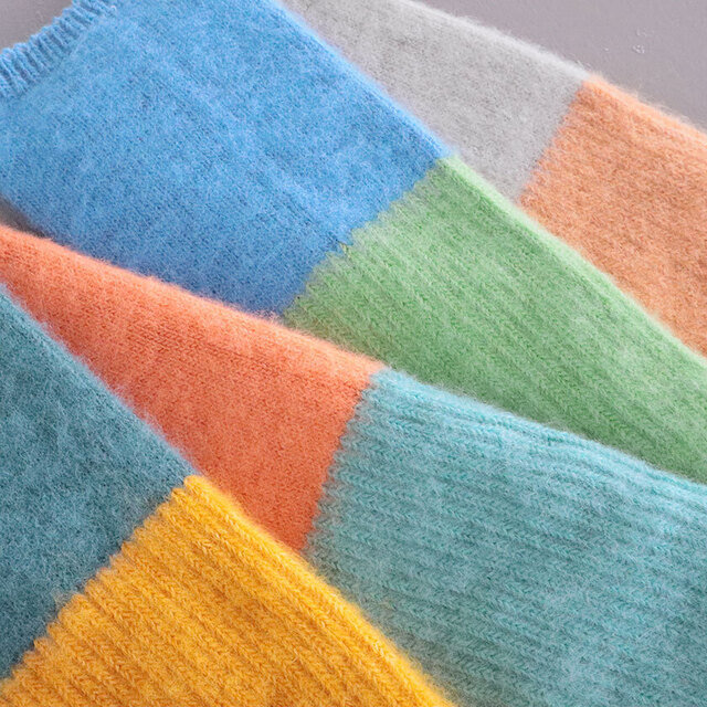 素材にはコットンとアクリルウールを引きそろえた編地を使用。異なる糸を組み合わせることで、一つの素材では出せない独特の色合いと質感を表現しています。表面に起毛をかけた、ふわふわで優しげな風合いが魅力です。